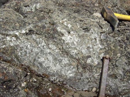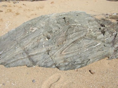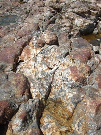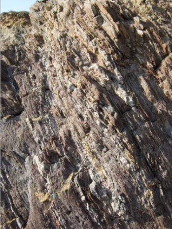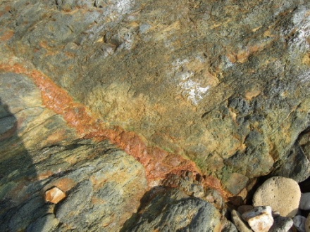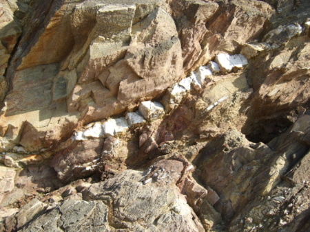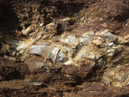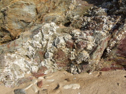 Les filons peuvent être remplis de barytine massive à crêtée (mais l'érosion due à la mer la rend peu présentable en surface) :