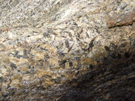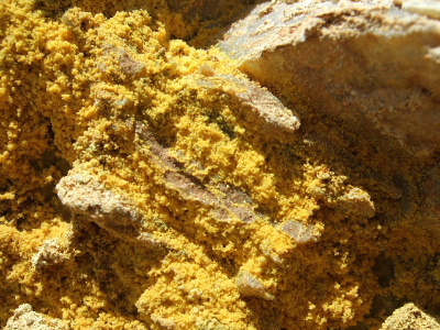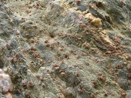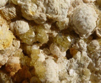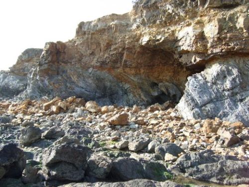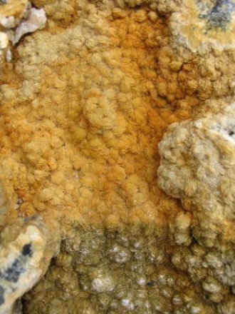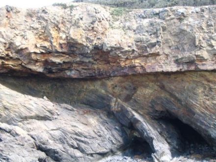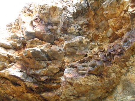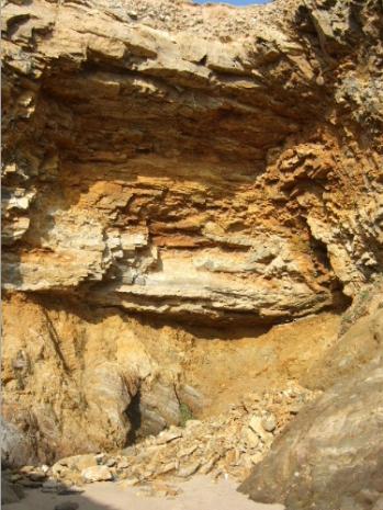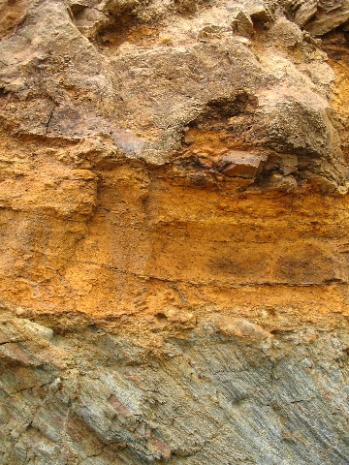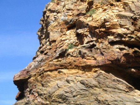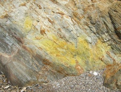 En plusieurs endroits de la falaise, dans la partie basse des micaschistes apparaissent des zones où la roche est recouverte de masses informes jaunâtres.