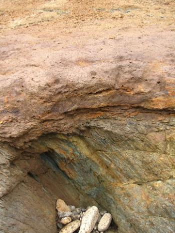 Commentaires : Les couches du dessous sont anciennes (paléozoïques). Elles ont subi un plissement ce qui les a penchées.