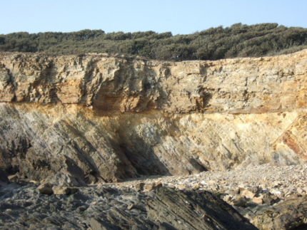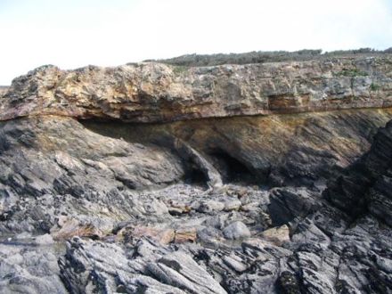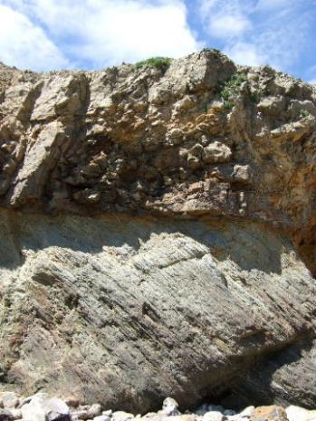Au fur et à mesure de la progression vers la pointe du Payré, les couches s'élèvent ce qui permet une belle observation en plein milieu de falaise de cette discordance.