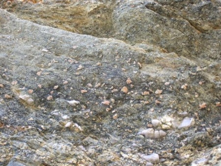 -Les couches inférieures paléozoïques (les plus anciennes ; nous les verrons plus en détail plus loin sur la côte) contiennent régulièrement des filons de quartz. Lors de l'érosion de ces couches, les filons de quartz ont été détruits et ce sont les morceaux de ces filons qui constitueront par endroits le conglomérat quartzeux. On peut remarquer que les morceaux de quartz sont anguleux (donc pas de transport : origine locale).