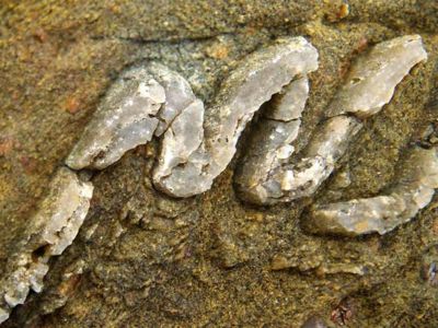 -Lors de la transgression, une matière brunâtre calcaire (effervescence à l'acide) a soudé grossièrement ces morceaux de quartz en donnant le conglomérat.