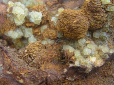 La présence fréquente dans la zone de pyrite de fer FeS2 laisse penser à de la mélantérite FeSO4 , 7 H2O. Celle-ci est en effet un minéral secondaire formé par l'oxydation (sous l'action des eaux de surface) des minéraux sulfurés de fer, comme la pyrite et de marcassite, il se trouve naturellement présent dans les crevasses et les cavités abritées roches sédimentaires et métamorphiques sulfurées.