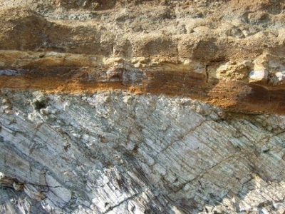 On appelle discordance cette rupture de disposition des couches : penchées en dessous, horizontales dessus ! Cela traduit ici une transgression (retour de la mer après un retrait plus ou moins long).