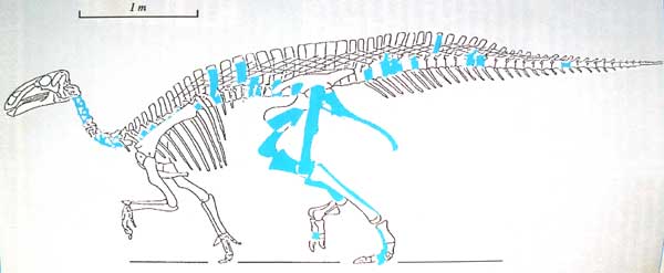 12.3. Reconstitution du squelette de l’Iguanodon atherfieldensis de l’Hauterivien de Wassy (Haute-Marne). Les os conservés sont indiqués en bleu.