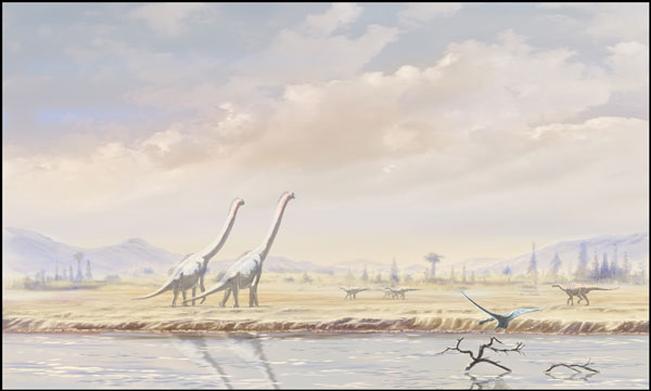 Paysage du Crétacé inférieur, parcouru par Iguanodon et des sauropodes (brachiosaures).