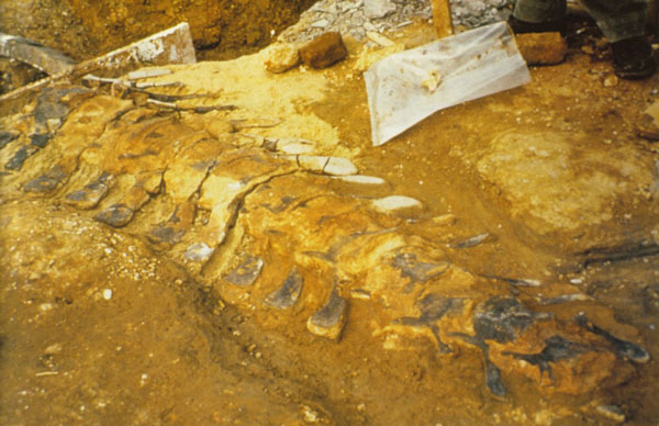 12.2. Portion de colonne vertébrale d’Iguanodon bernissartensis en cours d’extraction dans le Barrémien de Saint-Dizier en 1971.