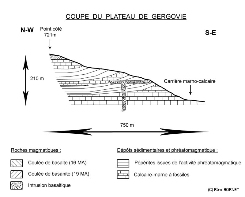 A la fin de ces évènements, deux coulées de lave vont recouvrir toute la structure, l'une est datée à -19 Ma et la seconde à -16 Ma. Ces coulées vont jouer un rôle de bouclier protecteur contre les phénomènes érosifs, évitant la désagrégation des formations plus ou moins carbonatées sous-jacentes. L'érosion sculptera le paysage durant 16 millions d'années jusqu'à aujourd'hui où les coulées culminent à plus de 700 m et constituent le sommet du plateau de Gergovie, plateau dit "en inversion de relief".