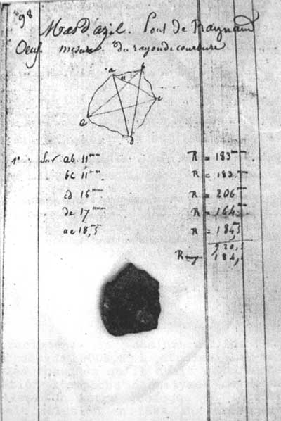 16.1. Fragment de coquille d’œuf de dinosaure trouvé par l’Abbé Pouech accompagné de ses notes manuscrites sur ce spécimen (collège Jean XXIII, Pamiers, Ariège).