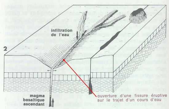 Dès que le magma entre en contact avec l’eau, il subit une « trempe » superficielle sans se mélanger avec elle. L’alimentation en eau étant continue (ruisseau, nappe d’eau souterraine), la pression de l’eau s’oppose à l’ascension de la colonne magmatique. Mais dans le même temps, la base de la colonne d’eau surchauffe et se vaporise. L’augmentation de pression qui en résulte déclenchera alors une violente explosion, essentiellement gazeuse qui projette à l’extérieur bombes trempées et blocs du socle arrachés à la cheminée.