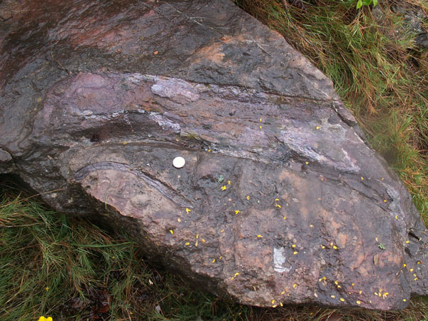 17.4. Fémur de titanosaure et côte de dinosaure indéterminé dans un bloc de calcaire du Masstrichtien supérieur, région de Saint-Chinian (Hérault).