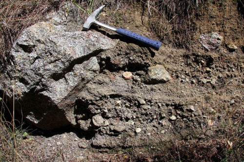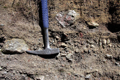 Les produits d’explosion couronnent la dépression et sont bien visibles sous le Suc de Pal. Ces produits de maar s’accumulent sur près de 200 mètres d’épaisseur. On peut y observer une série de lits clairs, à grains peu soudés.