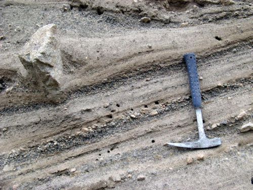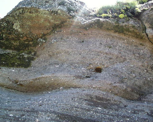 On observe aussi un peu plus loin une alternance de couches palagonitisées (de couleur jaune-orange) et de couches noires, ce qui montre que le régime de ce volcan n’a pas toujours été le même.