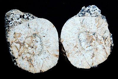 - 5/ Faciès à grands orbicules. : La taille des orbicules qui se forment augmente régulièrement à mesure que celle des noyaux s'accroît par capture de nouvelles particules de mica, tandis que le refroidissement du magma entraîne la cristallisation d'un plagioclase de plus en plus sodique (An. 7) qui constitue la première enveloppe. A la fin de cet épisode plagioclasique, le feldspath potassique cristallise à son tour massivement et vient tout naturellement se fixer sur les gros orbicules encore en suspension dans le magma pour former la deuxième enveloppe, de largeur équivalente à la précédente.