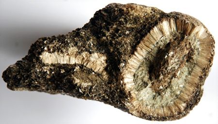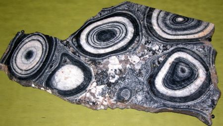 Les orbicules ont un noyau constitué par du mica phlogopite, entouré par une couche rayonnante d’anthophyllite et de trémolite deux variétés d’amphibole partiellement transformé en chlorite. Une fine couche de biotite entoure l’orbicule à sa périphérie.