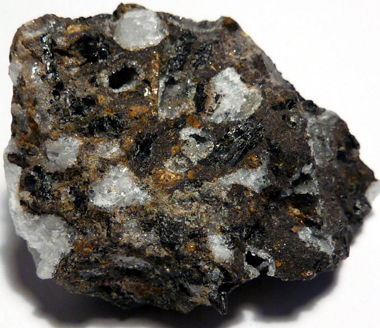 Dans les cavités arrondies : des minéraux blancs secondaires de calcite, aragonite, zéolites.