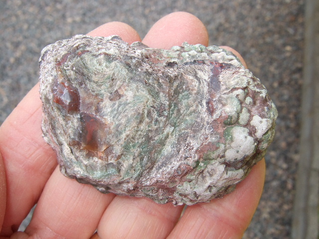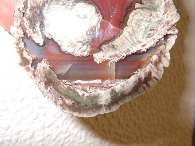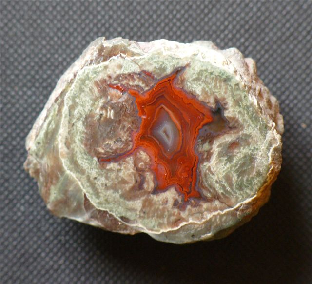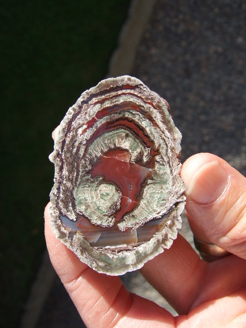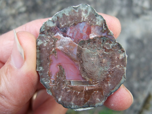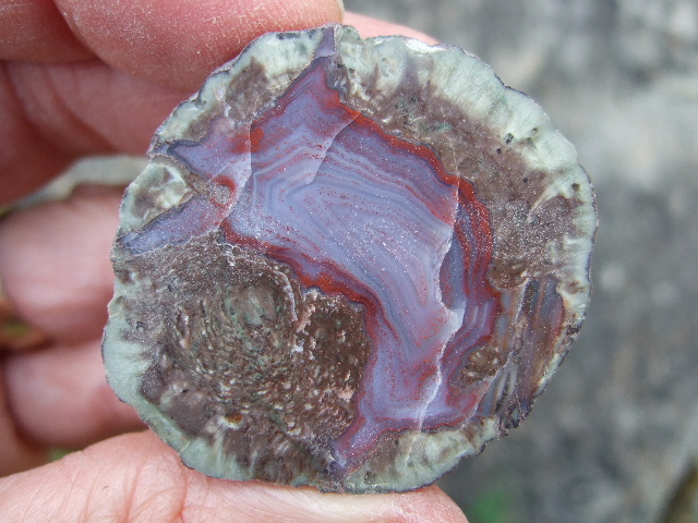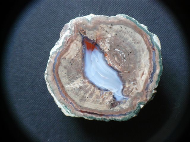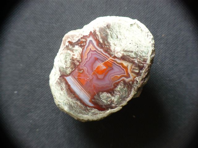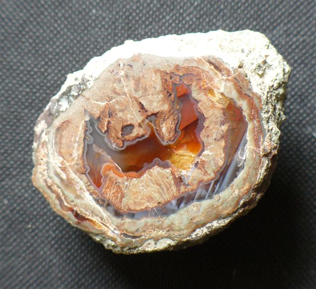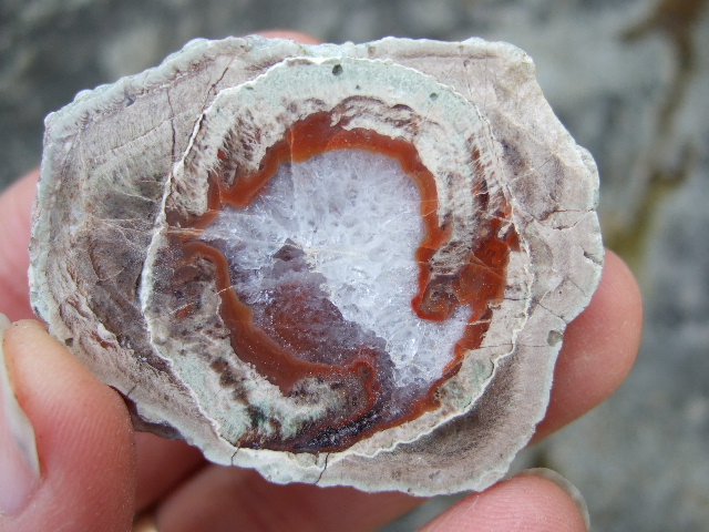 • à l’intérieur, des couches de couleurs diverses (rouge, rose, bleue, grise..) et de formes diverses. C’est de la calcédoine (silice microcristalline) diversement colorée par des oxydes.