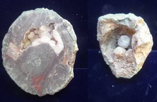 L’espace restant (lorsqu’il existe) a pu être rempli ensuite par du quartz (silice cristalline) de l’extérieur vers l’intérieur de la cavité ce qui explique l’orientation vers le centre des cristaux.