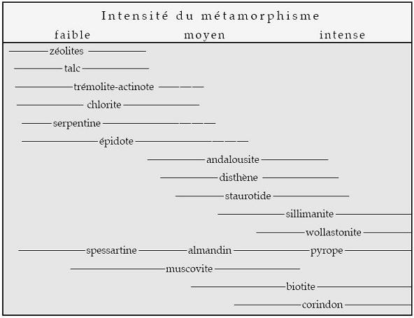 Le métamorphisme présente des degrés définis par les conditions P et T (pression et température). Chaque minéral possède un champ de stabilité ; l'apparition de certains minéraux, la disparition d'autres minéraux - tout en tenant compte de la composition chimique des roches - permet de définir les faciès minéraux définis selon la paragenèse. Voici quelques-uns de ces faciès et sous-faciès donnés du degré le plus bas, aux degrés les plus élevés :