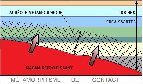 Le métamorphisme de contact, se localise au contact des roches magmatiques, il affecte les terrains traversés par l'intrusion magmatique ainsi que des enclaves. Lié au gradient et à la durée de l'élévation de température, il est appelé métamorphisme thermique, ou thermométamorphisme. La zone métamorphisée dessine une auréole de métamorphisme de contact autour de l'intrusion (cornéennes, skarns, etc).