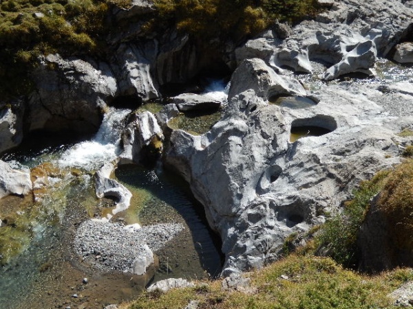 Les marmites sont creusées progressivement lors du mouvement de rotation de graviers ou de galets sous l'effet de l'eau d'un torrent ou d'un cours d'eau. Le plus souvent, la nature du fond du cours d'eau est plus tendre que les éléments mis en rotation par l'eau, ce qui facilite grandement la formation de ces marmites. Dans la vallée d'Estaubé présentée ici, le sous-sol est formé de marbre blanc.