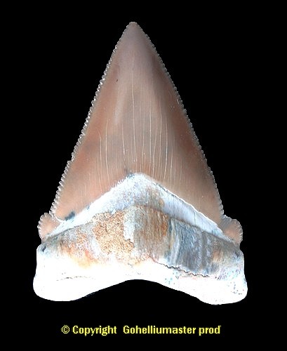 De taille déjà respectable de plus ou moins une dizaine de mètres, il possédait un bel arsenal de dents acérées. Elles étaient finement crénelées avec des cuspides latérales légères, beaucoup moins marquées que C.angustidens. La cuspide principale de la dent, ou couronne émaillée, en photo (1ère latérale inférieure), est incurvé du coté de la face labiale…les crénelures sont légèrement plus irrégulières que chez le megalodon et les dents de cette espèce possédait aussi, comme ce dernier, un bourrelet lingual. Cette espèce a vécu de l’Oligocène terminal au Miocène moyen…