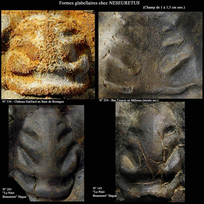 A contrario, certains spécimens du Petit-Beaumont / Hague (Manche) montrent une glabelle paraissant relativement allongée (Voir photos n° 9, ligne inférieure ; 15, 16 & 17).