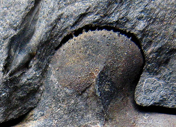 Position du tubercule médian de l'anneau occipital chez Neseuretus tristani (Llanvirn - Le Petit Beaumont/Hague-Manche) Champ de 1,5 cm environ.