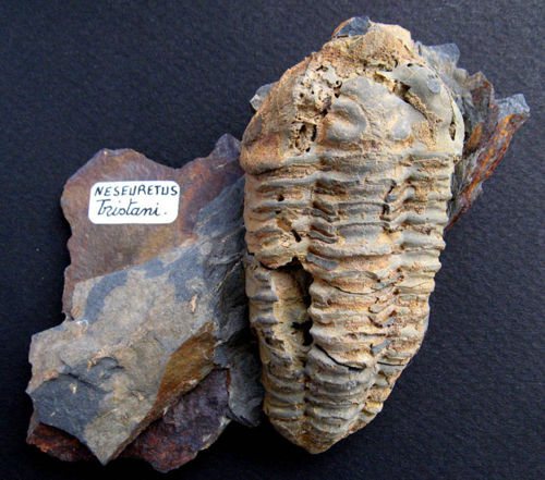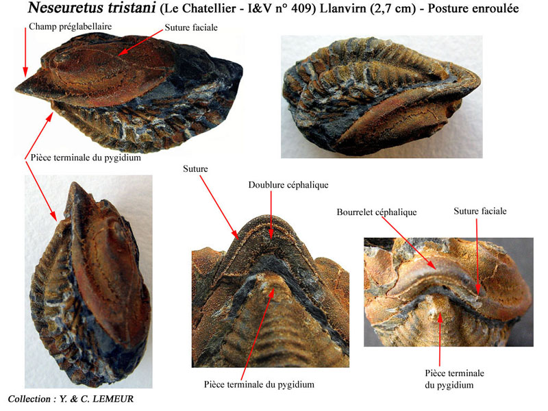 Profil céphalique caractéristique de Neseuretus tristani - Spécimen (2,5 cm) du Llanvirn de la Hunaudière en Sion les mines (I & V)