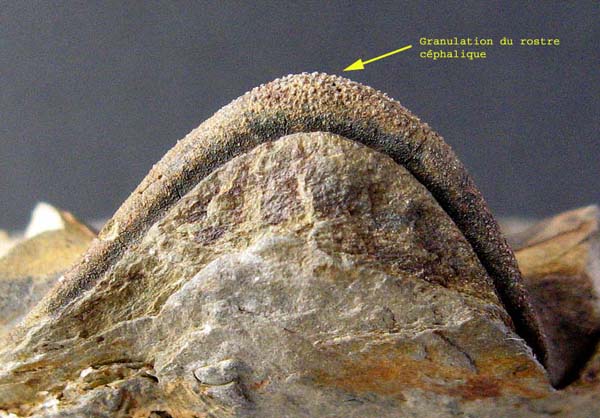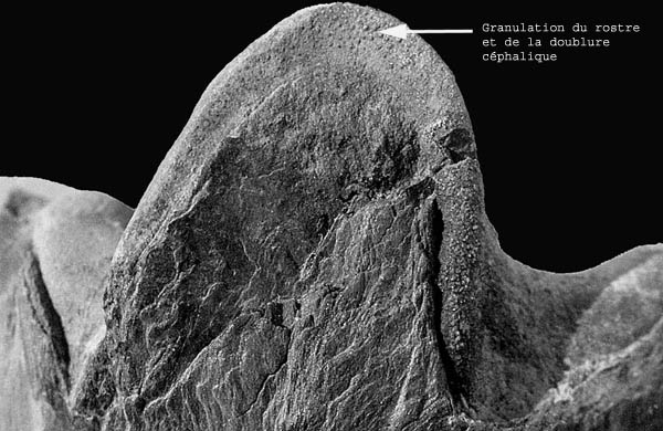 La zone pré-glabellaire est remarquable, elle représente le 1/3 de la longueur du céphalon. Le champ préglabellaire est large, brusquement relevé, projeté vers l’avant et plié en forme de gouttière. Son profil est très légèrement convexe. L’ensemble prend l’aspect d’un mufle. Le bourrelet céphalique, discret mais parfaitement identifiable, est couvert de tubercules avec accentuation en zones périphériques (voir photos n° 20, 21 & 22). Ceux-ci sont également présents sur sa partie supérieure. La dépression située entre bourrelet frontal et glabelle est lisse ; Cette zone est parfois parcourue par une remarquable ride sinueuse reliant le sillon préglabellaire, à la partie supérieure du bourrelet frontal. Elle correspond en partie à un éclatement de la surface du test.