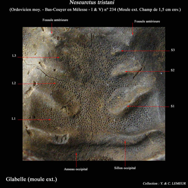 L’existence de ce tubercule chez Neseuretus Tristani ne fait aucun doute (voir photo n° 23). Il apparaît sur tous les spécimens bien conservés, les moules internes en particulier. On observe également une importante granulation de l’anneau occipital. Ce tubercule, considéré comme étant un organe sensoriel, existe également chez les genres Dionide, Guichenia, ainsi que chez certains Asaphidæ. C’est donc là un caractère assez commun des trilobites de l’Ordovicien moyen.