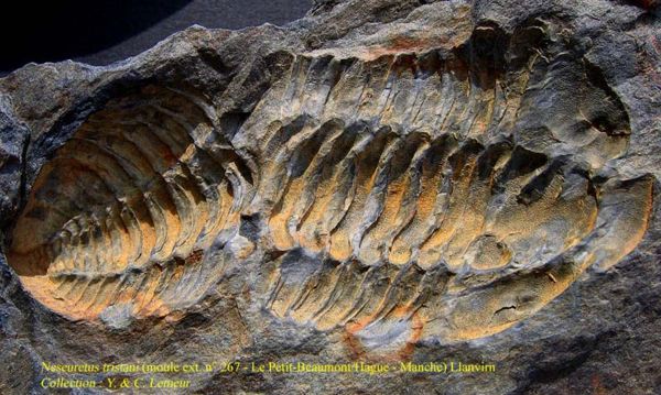 « Le Petit-Beaumont » : Hague (Manche. Environ à 2 kms au SE d’Herqueville). L’abondance de Neseuretus est remarquable dans le Llanvirnien du nord Cotentin. Ce sont ici les silstones noirs de la formation des schistes de Beaumont. L’association Neseuretus sp. ; Crozonaspis morenensis ; Kerfornella ; Ectillænus est typique de la formation d’Urville (Calvados), située dans le Llanvirn (Cette association est également connue à St Germain s/Ay – Manche). La conservation du matériel est bonne, permettant l’examen de fins détails.
