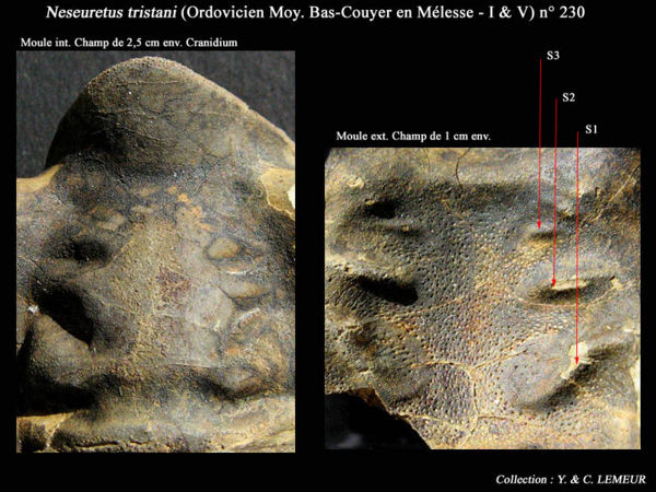 NOTES : Dans la mesure du possible, moule interne et externe doivent être conservés, Neseuretus tristani en est un bon exemple. En effet un certain nombre de caractères morphologiques ne sont clairement identifiés que sur l’une ou l’autre de l’empreinte fossile. Ainsi chez Neseuretus, la forte granulation de la carapace dorsale n’est le plus souvent observable que sur les moules externes (voir photo n° 10). Par contre, le tubercule médian de l’anneau occipital s’observe beaucoup plus aisément sur le moule interne (voir photo n° 23).