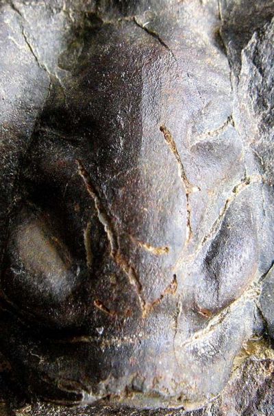 Cette légère ride est remarquable sur certains spécimens du Petit-Beaumont / Hague (Voir photos n° 13, 15, 17 & 18). Elle apparaît au niveau des S2, dans l’axe de la glabelle, pour s’effacer progressivement en zone frontale. Elle est inobservable sur les spécimens présentés photo n° 14 (Bas-Couyer) ou photo n° 6 ( Le Petit-Beaumont Hague /Manche), des exemplaires pourtant bien conservés.