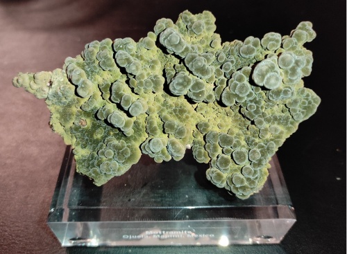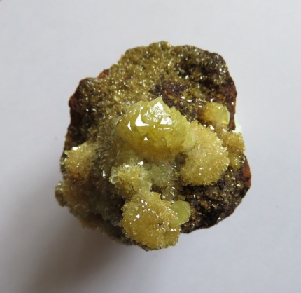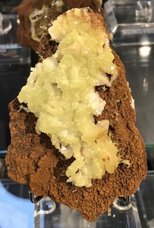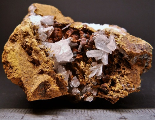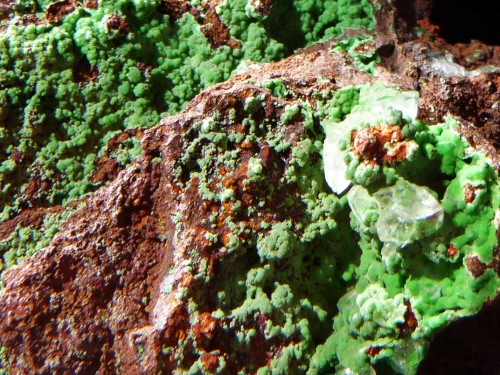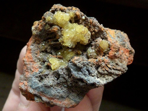 - Parmi ces premières découvertes mémorables, citons les adamites vertes, jaunes… souvent pluri centimétriques, en boules, en éventail ou en cristaux allongés, développées sur une matrice de gossan caractéristique. De petites poches seront ouvertes assez régulièrement depuis, jusqu’à nos jours, n’égalant toutefois que rarement en qualité les trouvailles des premières années.