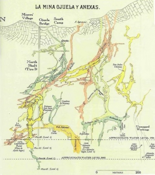 La mine d’Ojuela se présente aujourd’hui comme un réseau labyrinthique de près de 450 km de galeries qui s’entrecroisent dans les profondeurs du Cerro la India afin d’atteindre les sept dépôts minéralisés connus. Et comme si les choses n’étaient pas assez compliquées à décrire comme cela, la mine d’Ojuela est connectée sous terre à sept autres mines (America Uno, America Dos, Guadalupe, San Juan, Monterrey, Tiro Tres et Socavón)...