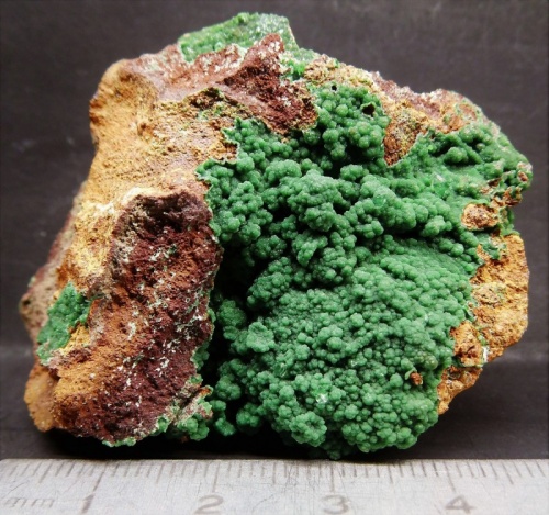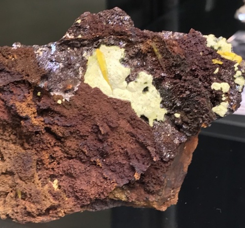 La carminite -PbFe3+2(AsO4)2(OH)2- est un rare arséniate de plomb et de fer, provenant ici probablement de l'oxydation d'arsénopyrite, et que l'on rencontre parfois associée à de la beudantite ou de la scorodite...