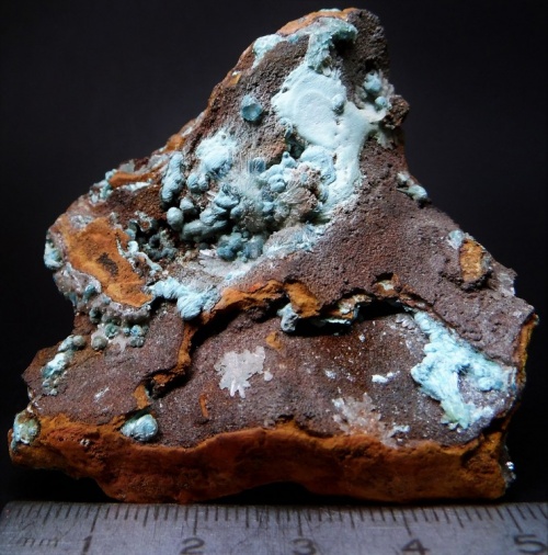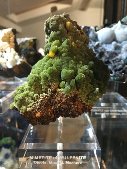 - Et dans les découvertes de ce début du XXIème siècle, on citera encore les cubes de fluorite violette, à la fluorescence rouge-cerise (à partir de 2007 surtout, aux niveaux 6 et 7 d’Ojuela-Paloma) ; les calcites colorées par des inclusions d’aurichalcite bleu-ciel (2009) ; les wulfénites jaunes pseudo-cubiques perchées au milieu de boules de mimétite vertes (provenant du 7ème niveau de la décidemment prolifique veine Poniente de San Juan –une page entière lui est d’ailleurs dédiée sur Mindat- ou encore de la veine La Campana, toutes deux dans la portion America Dos de la mine) ; les wulfénites oranges dipyramidales allongées (en 2008, encore de la veine Poniente) ; les wulfénites en tablettes bicolores dites « en sandwich » ou « oréo » (en 2017, toujours de la veine Poniente, au niveau 6) ; les dépôts botryoïdaux assez épais, souvent sculpturaux de rosasite turquoise, qui furent confondus au début et je ne sais trop pourquoi avec de la malachite ; les mottramites mamelonnées, parfois associées à de la wulfénite ; les scorodites bleutées ; les hémimorphites en tablettes translucides sur un lit de mimétite jaune (7ème niveau de la veine La Campana, ou encore 17ème niveau de San Judas)…
