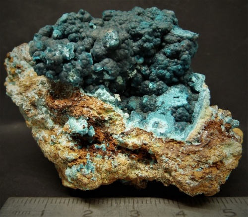- Puis sortent les mangano-adamites violettes en 1981 (poche découverte dans la cheminée de San Judas ; initialement étiquetés à tort comme cobaltifères, les plus beaux échantillons seront acquis par l’entrepreneur texan Sams Perkins -le même qui avait déjà sévi avec les azurites de Tsumeb dont nous avions parlé sur le sujet dédié-) ; les aiguilles rayonnantes de köttigite bleu pâle ; les symplésites gris-bleutées à l’éclat submétallique ; les austinites en globules ou en nœuds-papillon parfois donnés à tort comme de la smithsonite, incolores ou vertes ; les aurichalcites...