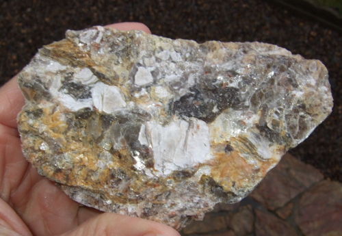 Pegmatite graphique :Les pegmatites graphiques (du grec graphein, « écrire », l'aspect de cette roche évoquant l'écriture cunéiforme) sont une variété de pegmatites dans lesquelles la cristallisation simultanée du quartz et de feldspath alcalin se manifeste par une disposition régulière de plages de quartz, isolées et cunéiformes, mais formant un unique cristal de quartz au sein du réseau cristallin d'un feldspath.