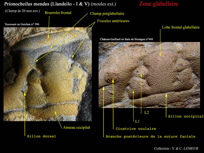 Une dépression lisse sépare le bourrelet frontal du sillon préglabellaire. Des fossules antérieures sont nettement visibles de part et d'autre du lobe frontal glabellaire.