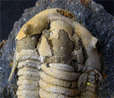 L'exemplaire n° 377 permet d’observer à la droite des 1er et 2ème anneaux axiaux, sur le sillon dorsal droit, un brachiopode articulé (genre Aegiromena ?). Ces organismes bivalves vivaient fixés sur un support, (peut-être ici la carapace d’un trilobite ?), soit par leur valve ventrale, soit par un pédoncule plus ou moins long. Ce phénomène se rencontre fréquemment sur la carapace des crustacés actuels. Ici hasard de la fossilisation (?), réel support (?) il est difficile de se prononcer...