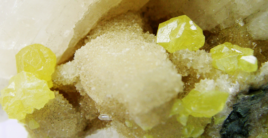 Mines de Machow, Tarnobrzeg, Pologne. (Soufre sur célestite, calcito-baryte. Collection Kayou) |