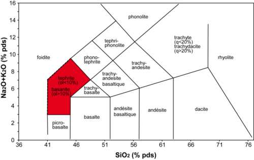 La téphrite est une roche volcanique basique (généralement mélanocrate) dont la teneur en SiO2 est basse, de l’ordre de 41 à 47 % pds et où la teneur en alcalin (Na2O + K2O) est comprise entre 3 et 9 % pds environ. Cette roche est aussi caractérisée par une forte teneur en fer et en magnésium.