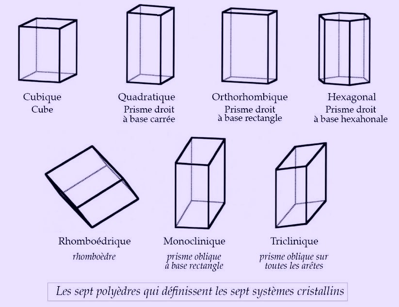 Un cristal qui se développe sans contraintes, peut prendre la forme du volume primitif, un des 7 systèmes cristallins