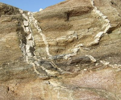 Les filons traversent la roche encaissante dans des directions variées.